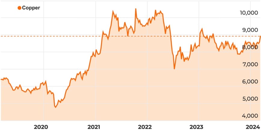 In the lead up, copper prices are tipped to hit as high as $13,000/t this year.